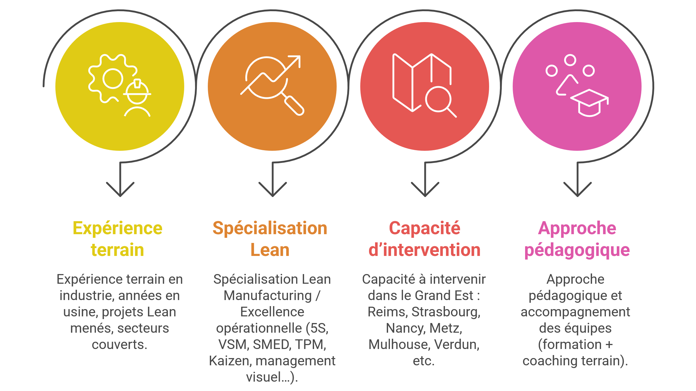 La sélection repose sur : expérience industrielle, spécialisation Lean/Excellence opérationnelle, capacité d’intervention sur le Grand Est et orientation résultats (réduction de stocks, amélioration OEE, baisse des rebuts…).