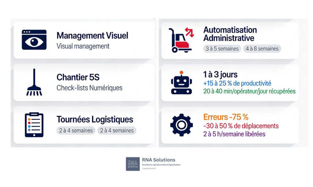 #1 Management visuel2 à 4 semainesQuasi nul (tableau + marqueurs)Réactivité terrain, +15 à 25% de productivité