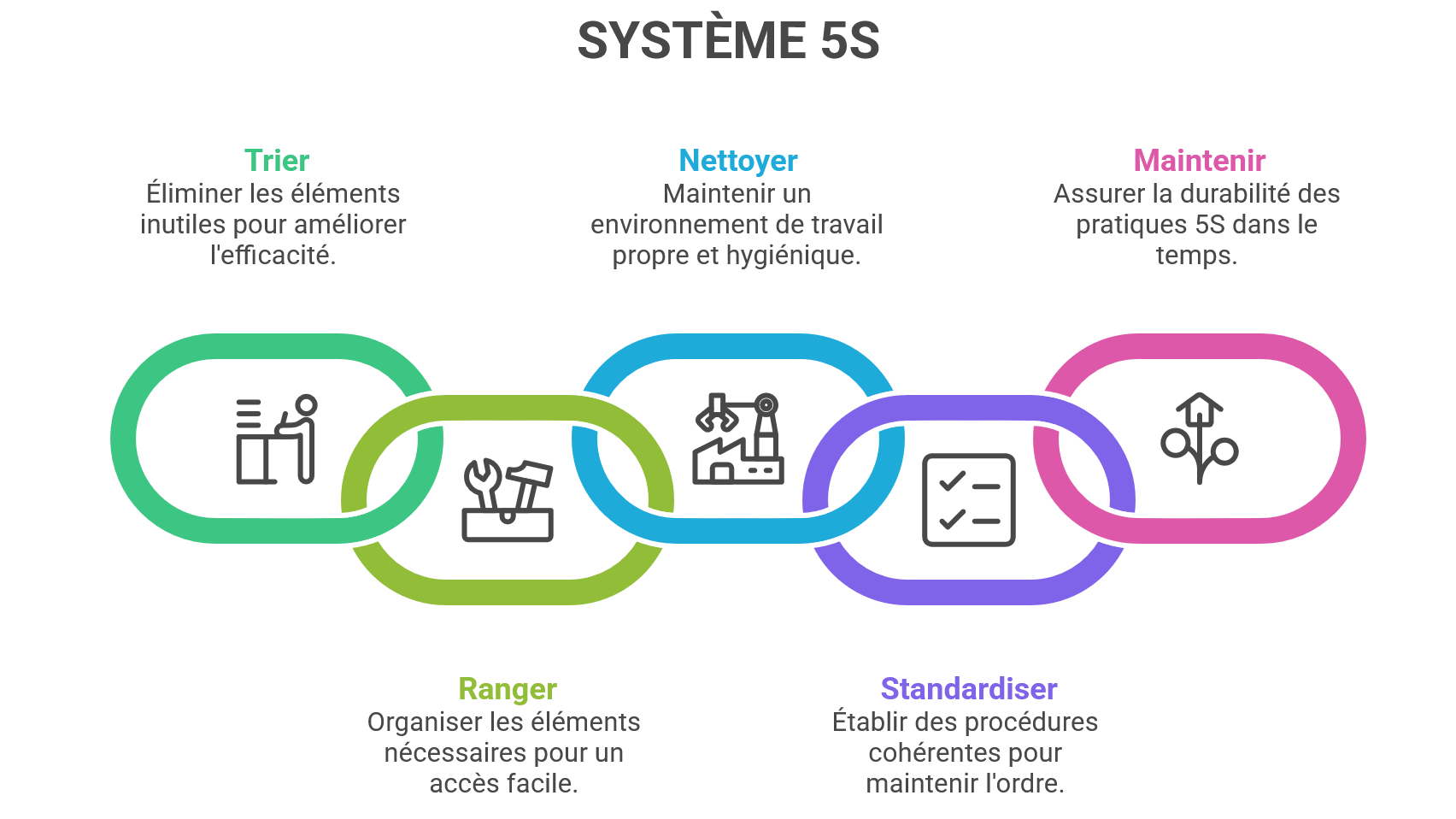 Ce que c’est : Les 5S (Seiri, Seiton, Seiso, Seiketsu, Shitsuke) sont la méthode Lean de référence pour organiser l’espace de travail. Ranger, éliminer l’inutile, standardiser, maintenir. Simple en théorie. Transformateur en pratique.
