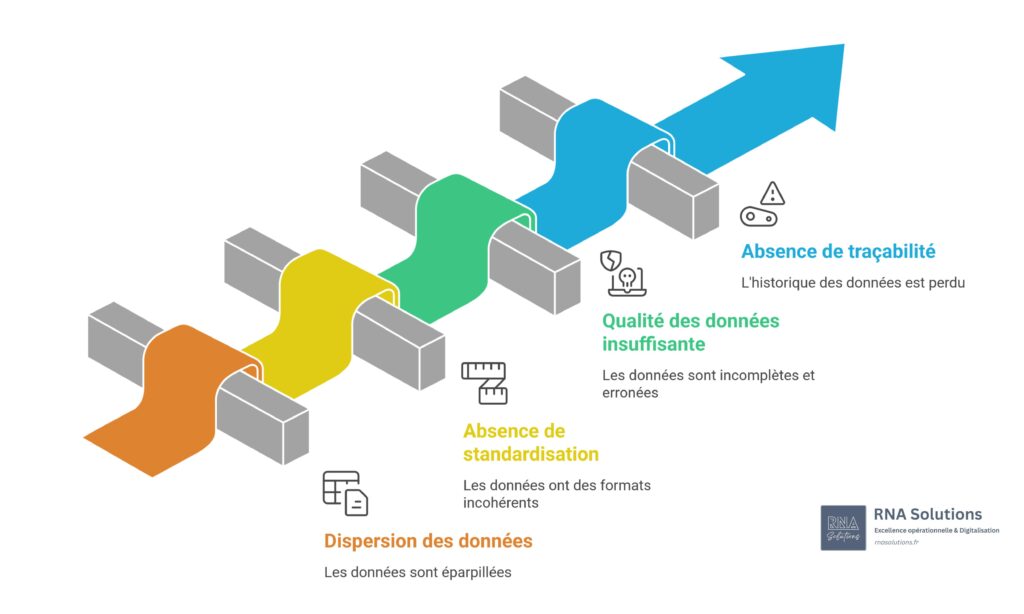 Même donnée = 5 formats différents. Un taux de rebut s’exprime tantôt en pourcentage (3,2%), tantôt en décimal (0,032), tantôt en pièces (32 rebuts/1000). L’IA ne peut pas apprendre sur des données incohérentes.