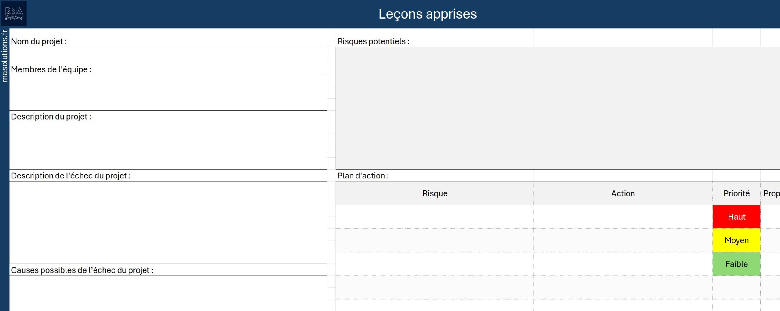 Le modèle Excel “Leçons apprises” est un outil pratique et efficace pour consigner, analyser et tirer parti des enseignements clés issus de vos projets et initiatives.